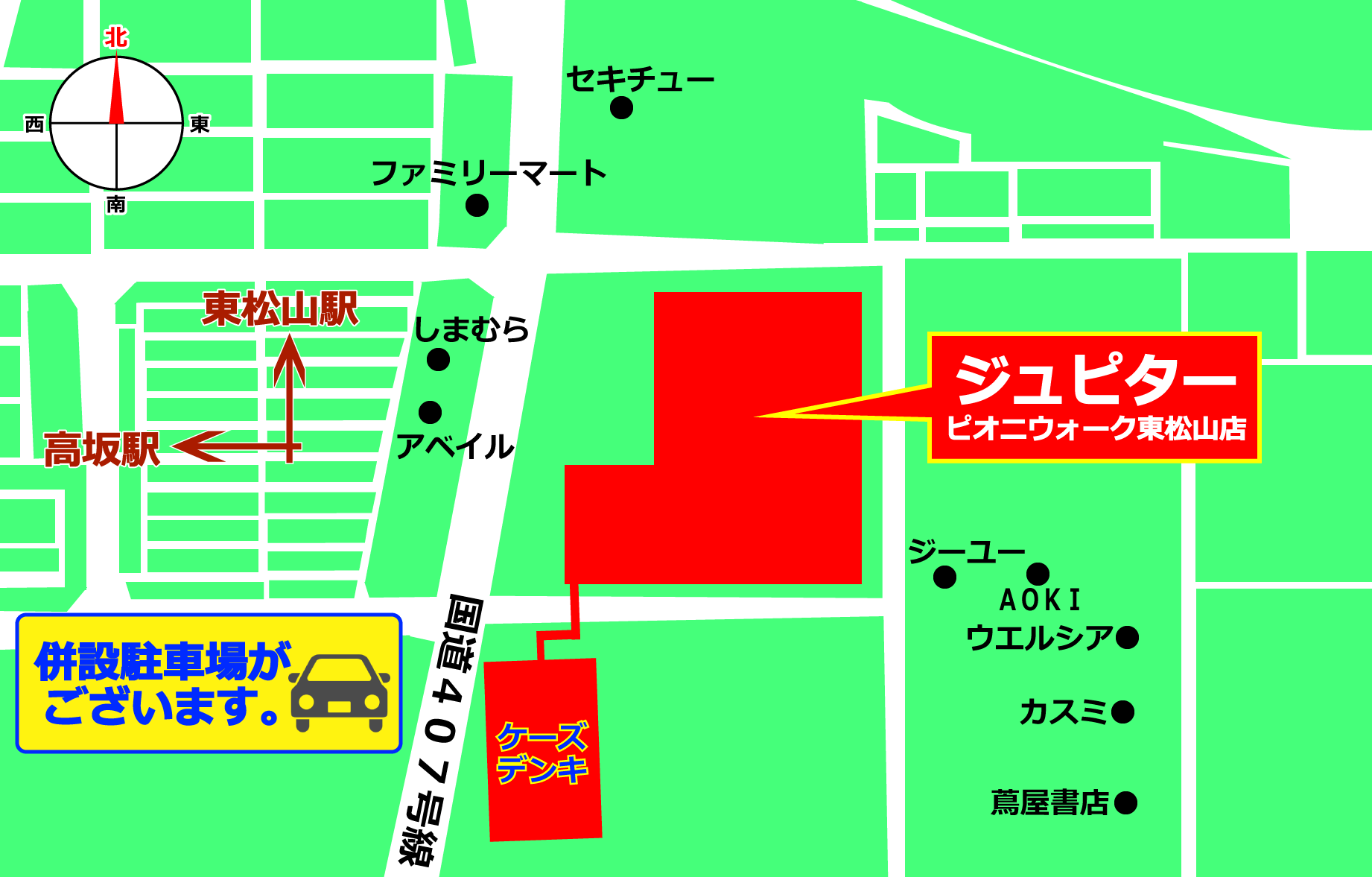 1階 「中央催事場」近くにジュピターがございます。![]() ・東武東上線「高坂駅」東口出口より 徒歩約15分 ![]() ・東武東上線線「坂駅」東口〜高坂郵便局前経由 〜ピオニウォーク東松山(所要時間5分) 川越観光自動車 路線バス(有料) ![]() ・ 関越自動車道…東松山ICより 約6km ・ 関越自動車道…鶴ヶ島ICより 約6km |