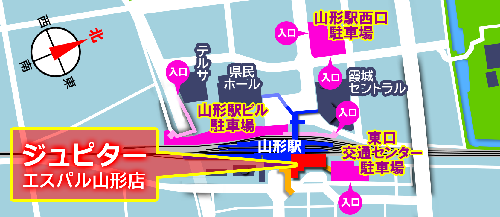 山形駅直結(東口寄り) 「S−PAL(エスパル)山形」1階にございます。 ![]() JR「山形駅」に直結。 |